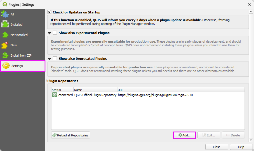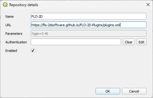3. Click the Add button to add the FLO-2D Plugin Repository.